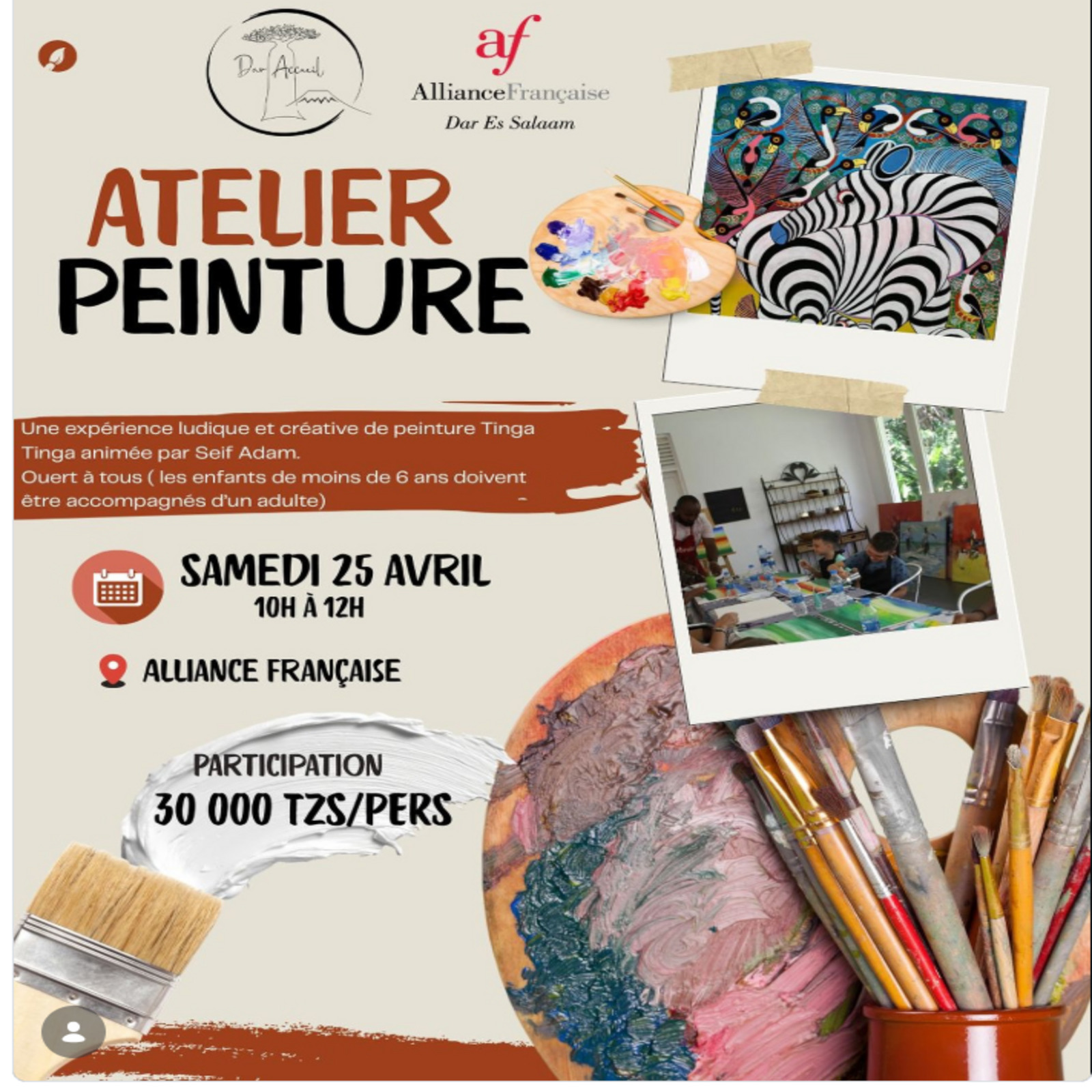 Apr 25 share 10:00 am - 12:00 pm TINGA TINGA PAINTING WORKSHOP Tsh.30000 Alliance Francaise, Dar es Salaam