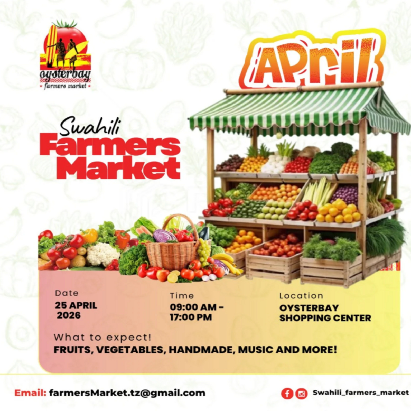 Apr 25 share 9:00 am - 5:00 pm SWAHILI FARMERS MARKET Oysterbay Shopping Center Ghuba Road, Dar es salaam