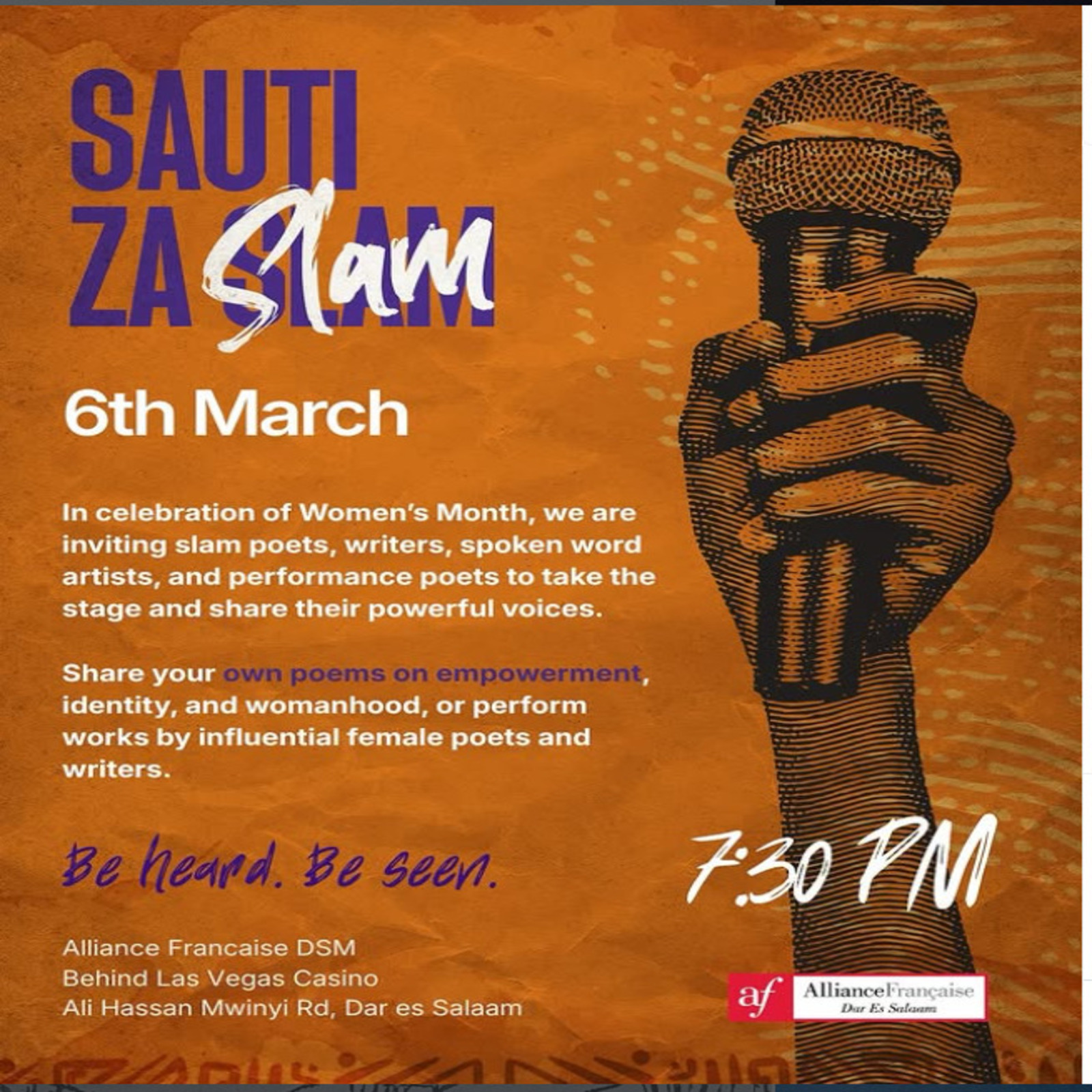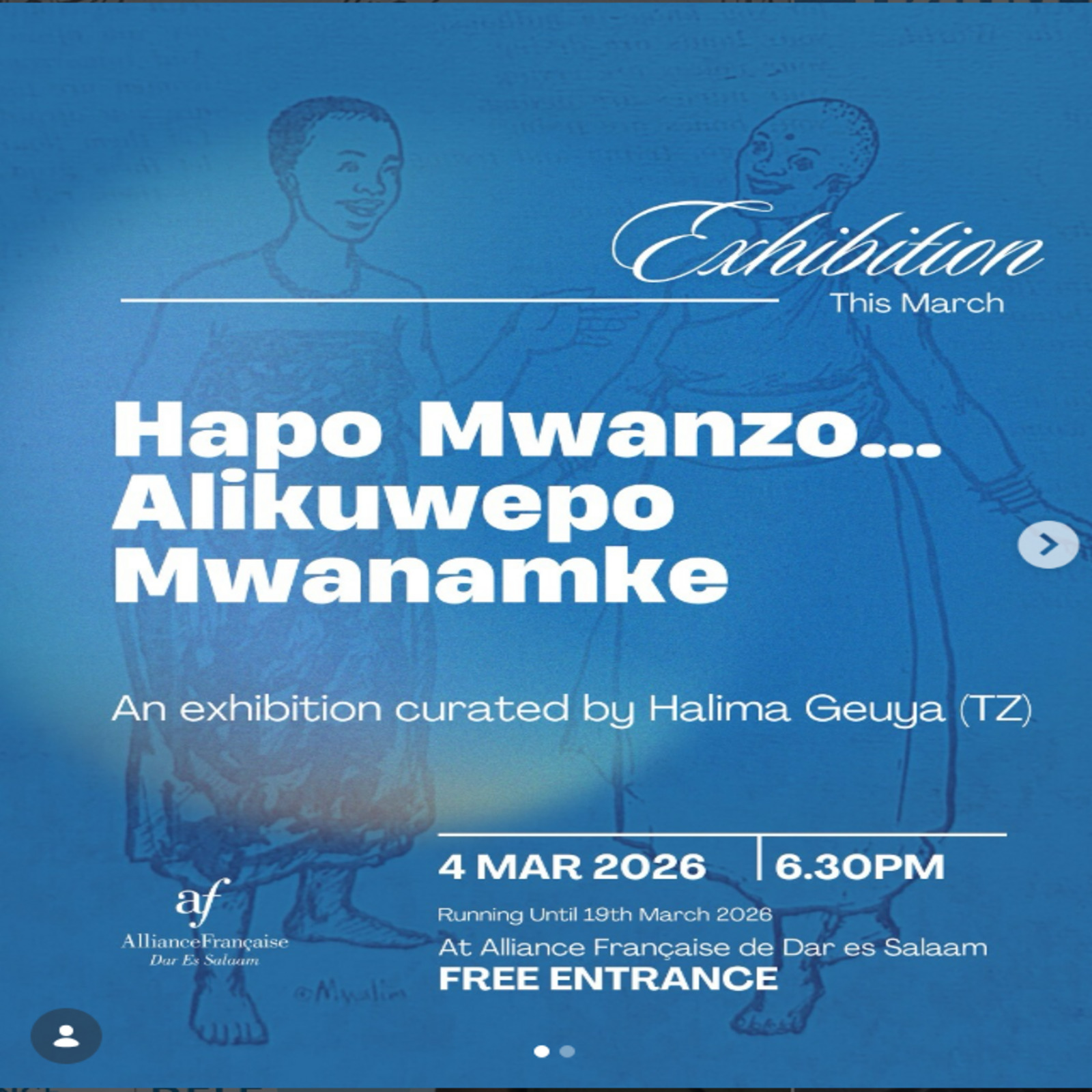Mar 4 share 8:00 am - 5:00 pm ONCE UPON A TIME THERE WAS A WOMAN EXHIBITION Free Alliance Francaise, Dar es Salaam