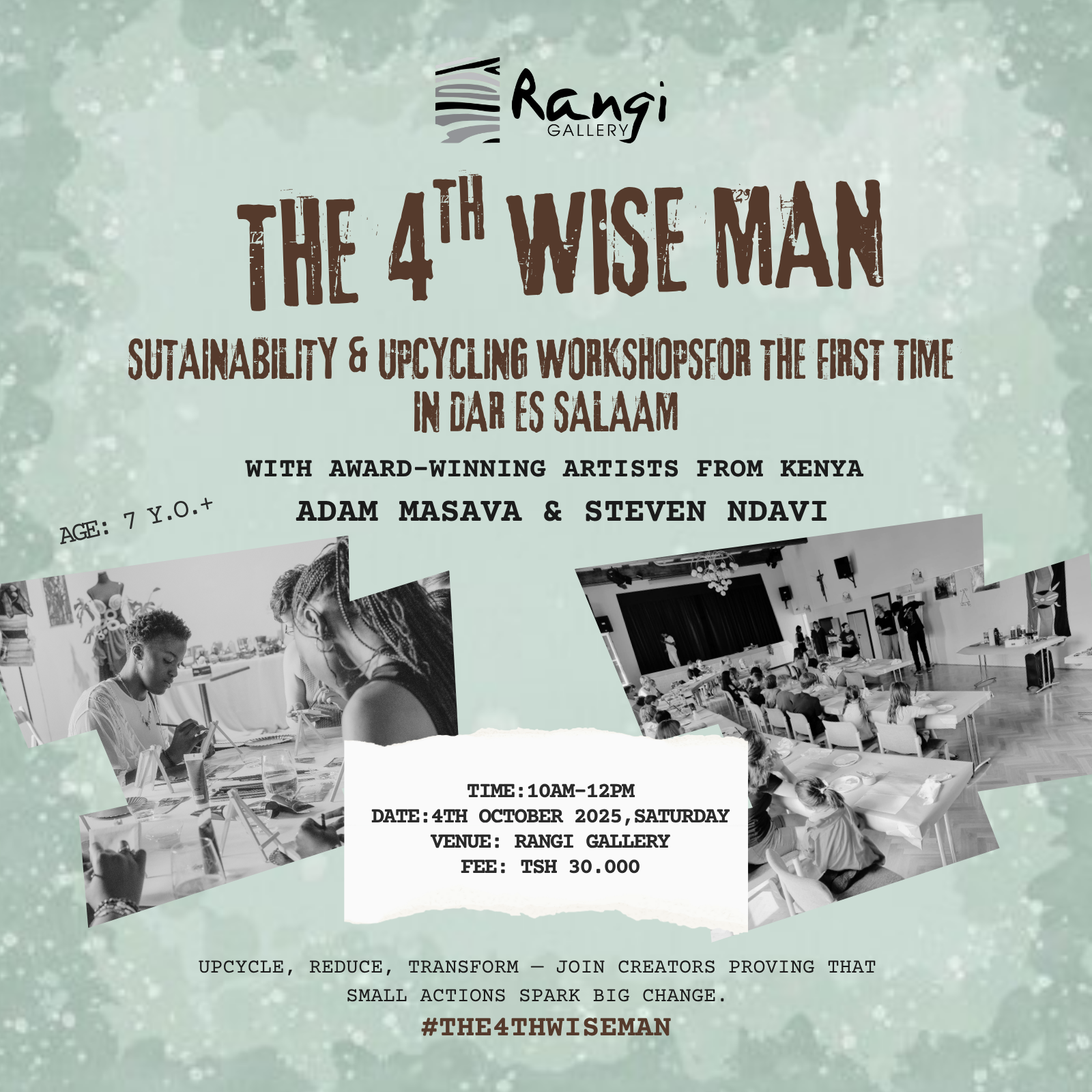 Rangi Gallery Rangi Gallery, Dar es salaam, Dar Es SalaamThe 4th Wise Man: Sustainability & Upcycling Workshops Upcycle, reduce, transform — join creators proving that small actions spark big change. For the first time in Dar es Salaam, The 4th Wise Man presents Sustainability & Upcycling Workshops — a hands-on experience where children and families learn how to turn discarded materials into powerful artworks, […]